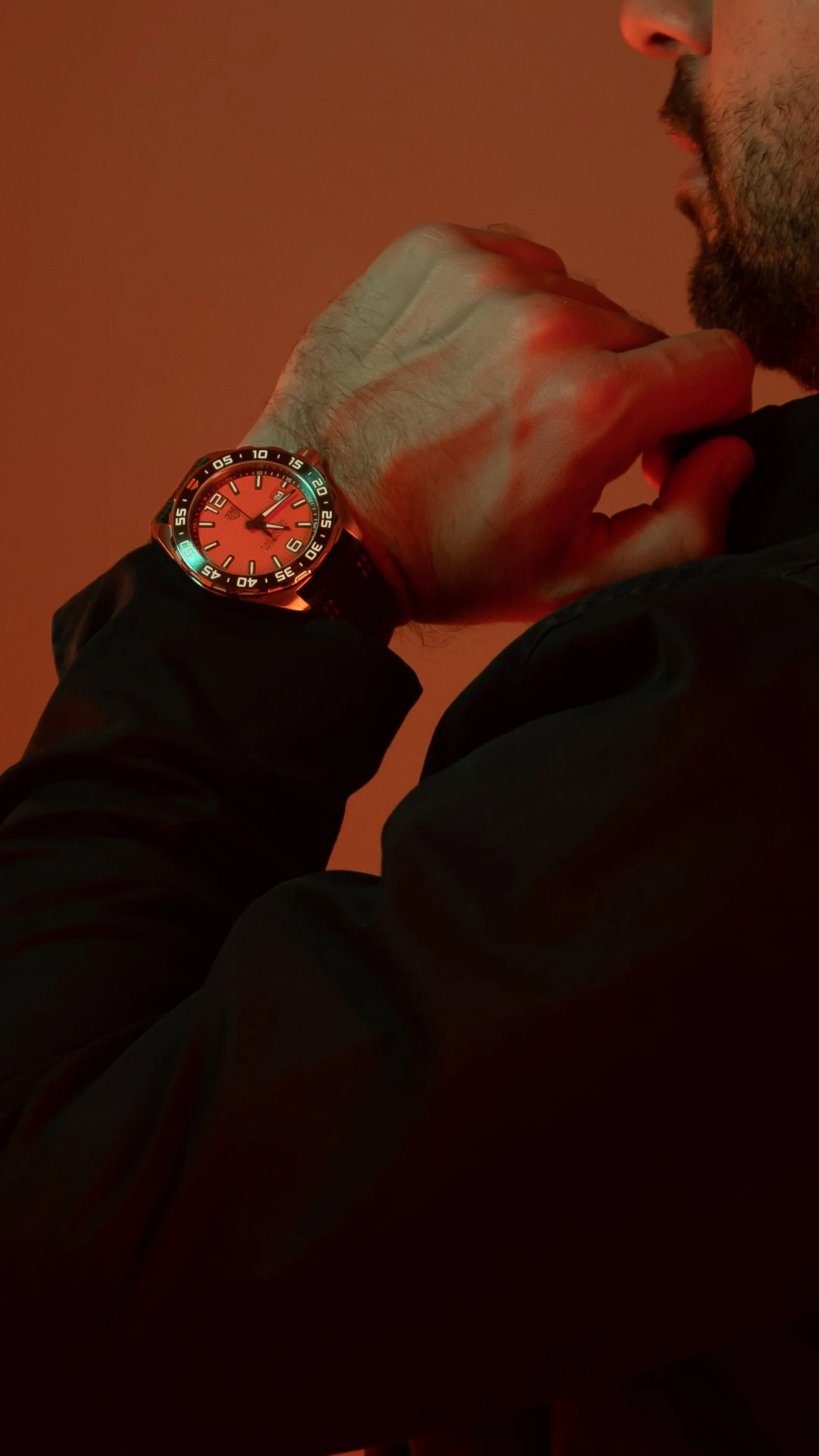 The long exposure streak of light in the final image was used to play on the theme of speed as this watch falls into the Tag Heuer Formula 1 collection.